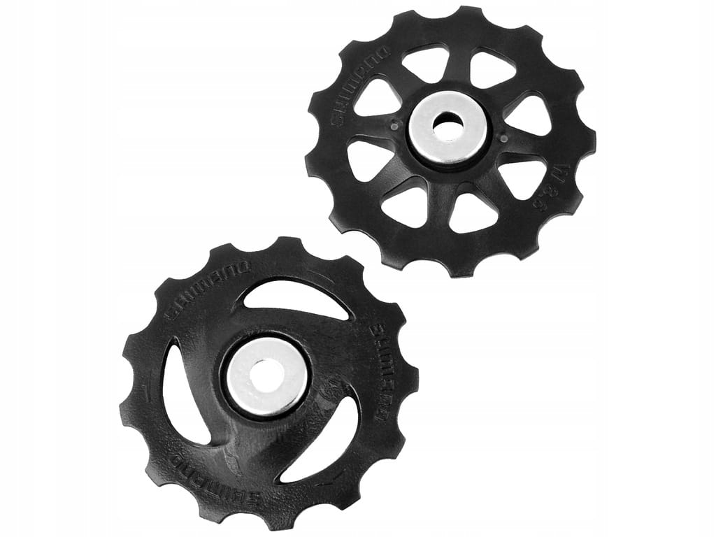 W zestawie znajduje się kółko prowadzące (górne) i napinające (dolne) tulejki oraz podkładki do przerzutek 8-rzędowych Shimano